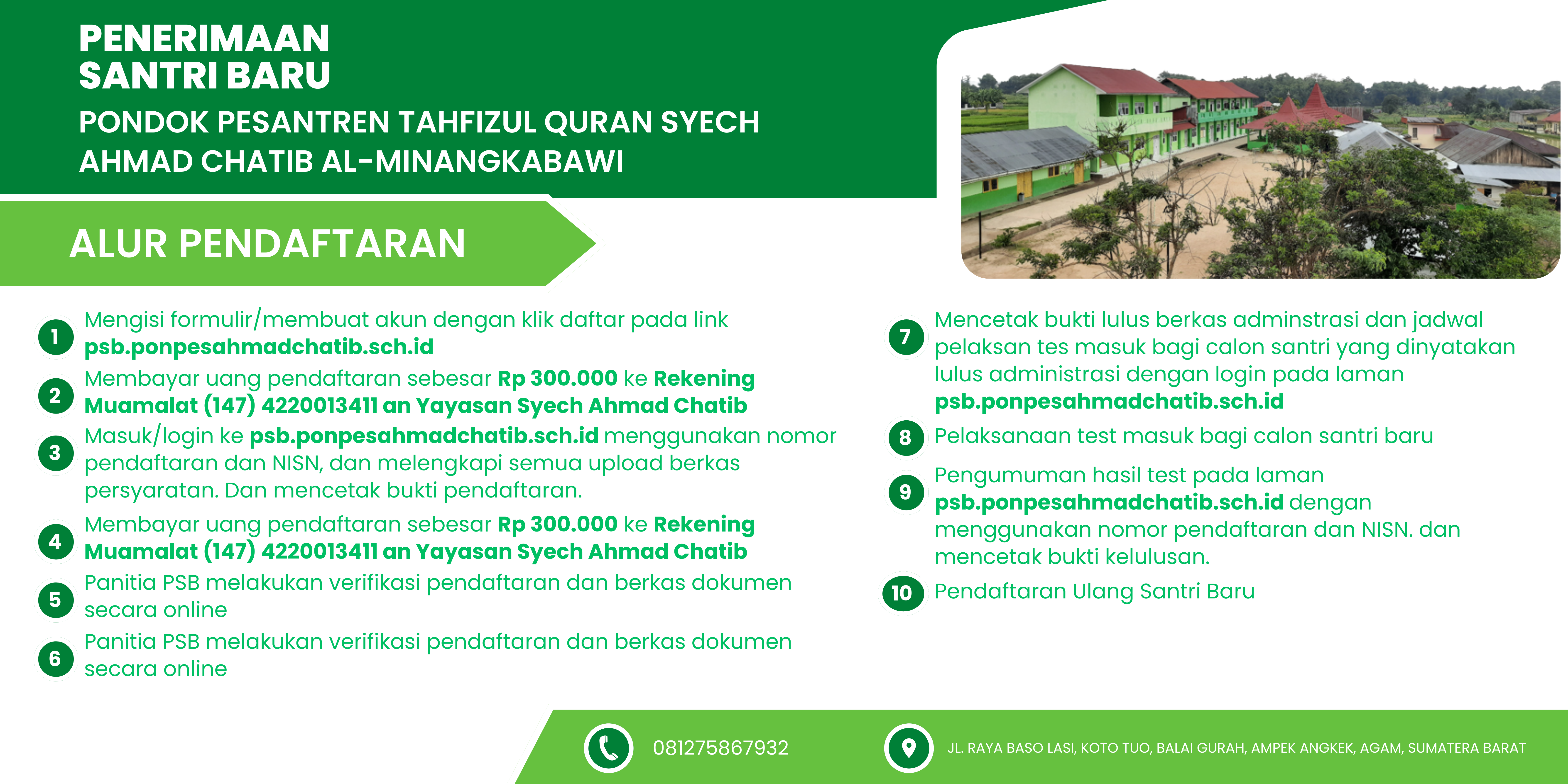 Proses pendaftaran PSB Online PONDOK PESANTREN TAHFIZUL QURAN SYECH AHMAD CHATIB AL-MINANGKABAWI hampir selesai. Silakan periksa kembali data-data yang sudah anda masukkan.